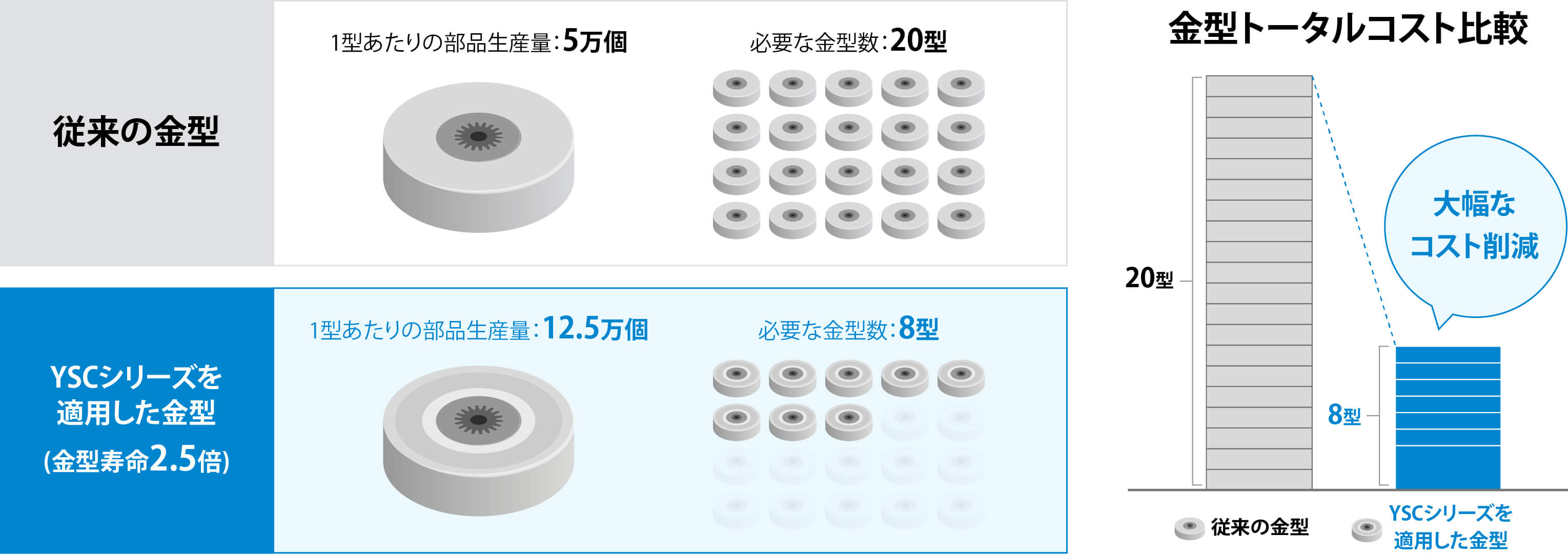 例えば、年間100万個生産する部品があり、金型1個あたりの生産量が5万個だったとします。これに、YSCシリーズを適用すれば、金型1個あたりの生産量が12.5万個になり、従来であれば20個必要だった金型が8個の金型で対応することが可能です。