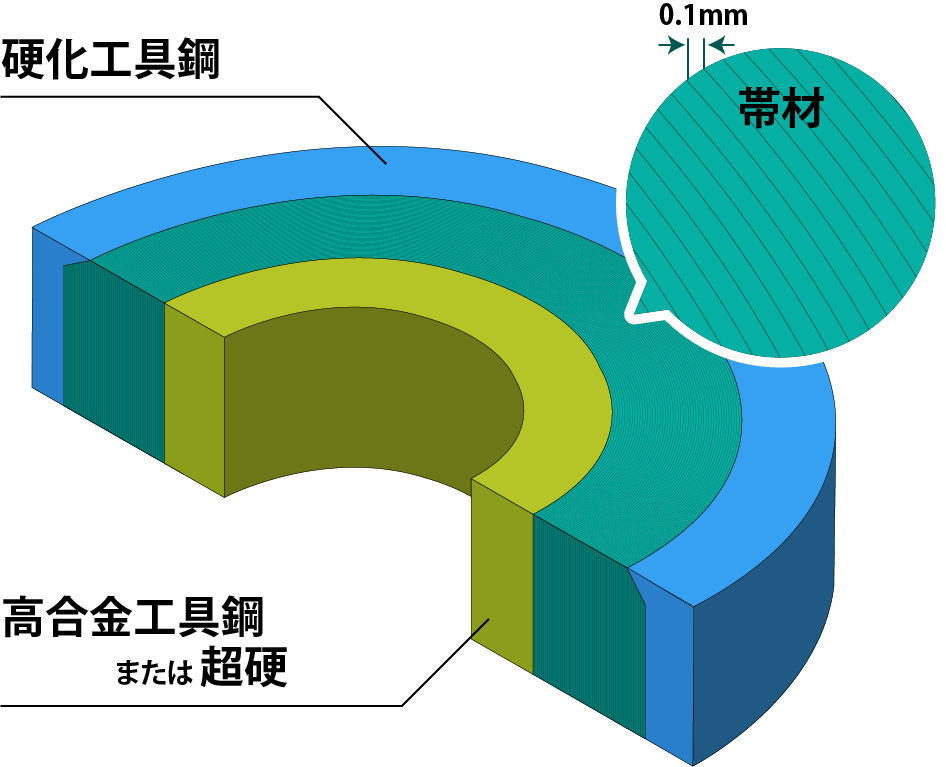 高合金工具鋼または超硬の内リングの周りに、特殊な熱処理を施した帯材(厚さ0.1mm)を、張力を完全に制御しながら何層にも巻き付けていきます。巻き付けが完了したら、その外周に硬化工具鋼のリングを焼ばめによって取り付けます。